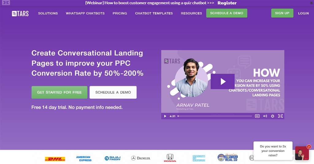 Tars steht für einen umfangreichen Chatbot-Baukasten, um menschenähnliche Dialoge für deine Website zu erstellen. Der Builder gehört zum Typ “Standardisierte Gespräche” und erfordert kein Programmieren von null auf. Die Tars-Funktionalität deckt Bedürfnisse der Marketing-Kampagnen jeder Größe ab. Dir stehen über 950 Bot-Vorlagen zur Auswahl, die du für dein Unternehmen per Drag-and-Drop vorbereiten kannst. In der Sammlung sind unterschiedliche Bereiche vertreten – Bildung, Finanzen, Gesundheitsbranche, Immobilien, Reisen, Recht und anderes mehr. Das Tool kommt in 25 Sprachen und lässt sich für verschiedene Einsatzbereiche verwenden. Bei Tars gibt es keinen kostenlosen Plan. Der Preis startet ab 99$ im Monat. Für 499$ erhältst du erweiterten Funktionsumfang mit Marketing- und Analytik-Instrumenten und Integrationen.