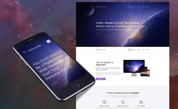 Den dritten Platz hat die vor kurzem entwickelte Vorlage gewonnen: Vielseitig einsetzbare Business-Website namens Evolution. Der Hauptvorteil dieser Vorlage besteht darin, dass sie für medizinische Zwecke, Webdesign Projekte, Autoreparatur und Immobilien geeignet ist. Das bedeutet, dass basierend auf einer Vorlage mehrere Projekte gestartet werden können. Darüber hinaus verfügt sie über 19 Seiten, damit ihr eine komplette Website erstellen könnt.