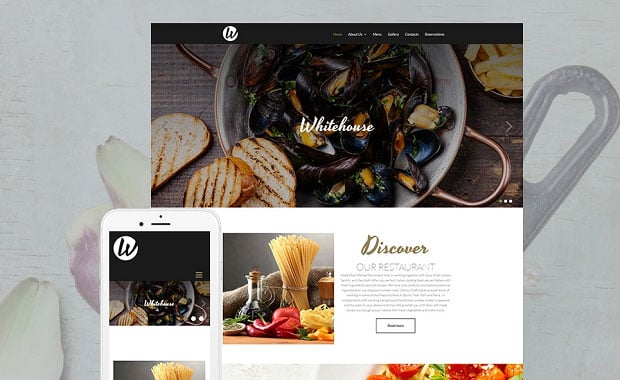 Unter der Nummer 5 ist eine Vorlage, die unter Chefköchen, Restaurantinhabern, Pizzerien usw. beliebt ist: responsive Homepage-Vorlage für ein Restaurant. Für eine komplette Website besteht diese Vorlage aus 7 Tabs und bietet umfangreiche Funktionalität an. Auf so einer Website können Kunden sich eure Speisekarte mit leckeren Gerichten anschauen und sofort online bestellen.