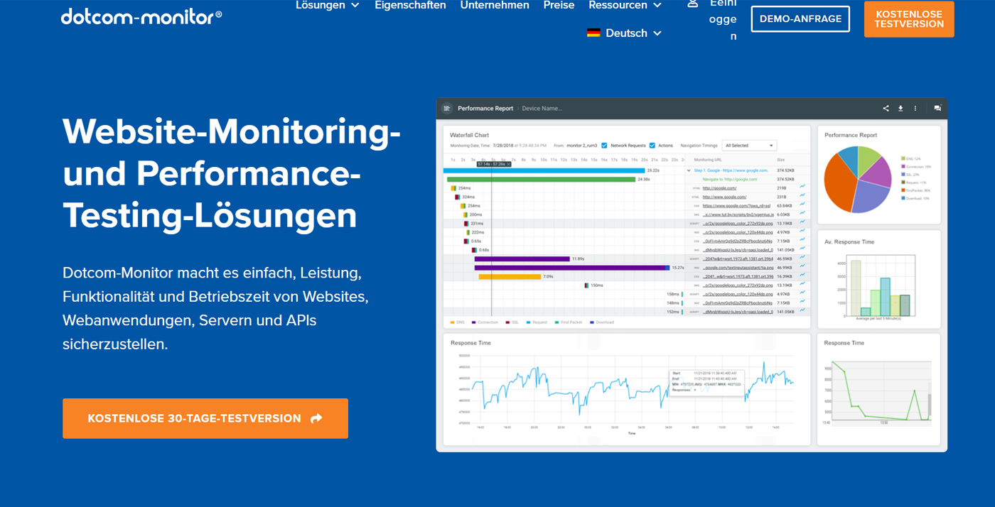 Dotcom Monitor ist ein Dienstleister, der ein breites Leistungsspektrum zum Webmonitoring bietet – von der Überwachung von Websites über Webanwendungen und APIs bis hin zu Webdiensten. Du kannst die Verfügbarkeit von verschiedenen Standortes aus testen lassen oder auf Leistungstests zurückgreifen, um die Performance deiner Website zu optimieren. Dotcom Monitor bietet zudem einen Service, um Benutzerinteraktionen zu überwachen.