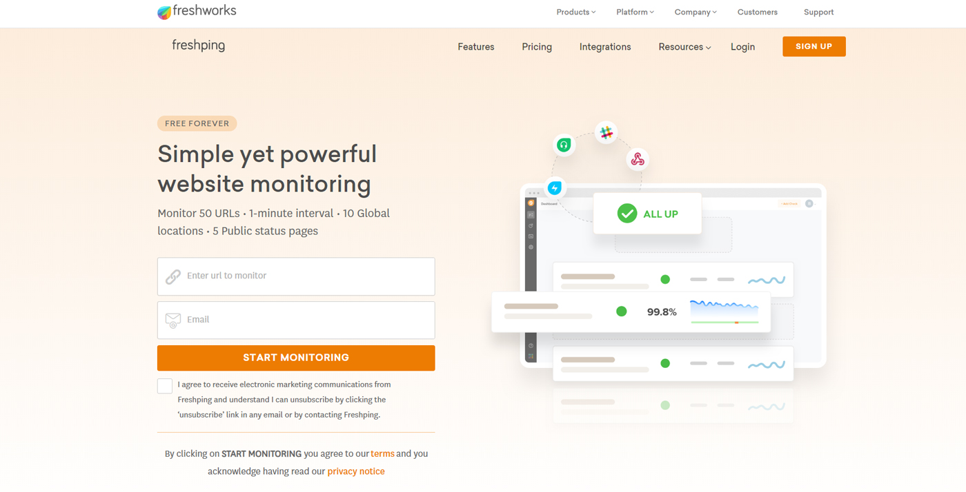 Freshping bietet kostenlose Sofortbenachrichtigungen und detaillierte Berichte über verschiedene Probleme auf Deiner Website. Dies ist eine pauschal anwendbare Einheitslösung, die auf den Websites von Startups und etablierten Unternehmen perfekt funktionieren wird. Es dauert nur ein paar Minuten, das Tool zu installieren und sofortige Überwachung Deiner Site in Echtzeit zu bekommen, sowie regelmäßige Warnmeldungen, wenn etwas schief geht.