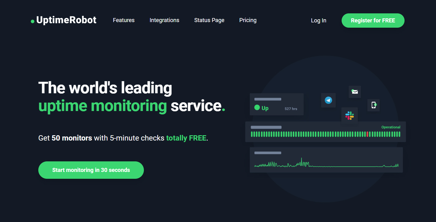 UptimeRobot ist eine kostenlose Software für Website Uptime Monitoring. Sie überprüft jede 5 Minuten den aktuellen Status Deiner Site. Falls es Probleme mit dem Code gibt, führt sie weitere Überprüfungen durch. Wenn die Probleme nicht behoben werden, sendet sie automatische Benachrichtigungen an Dich. Mit der Hilfe dieses Tools kannst Du bis zu 50 Websites gleichzeitig prüfen. Die Benachrichtigungen werden per E-Mail, SMS, RSS und anderen Kanälen gesendet.