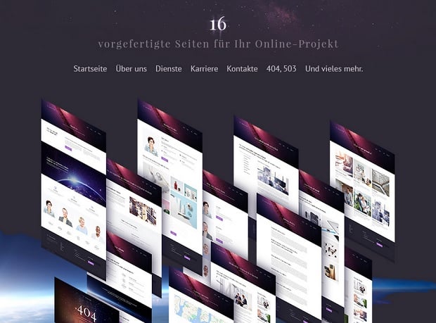 Evolution ist die beste mehrseitige Vorlage, die ihr je gesehen habt. Die 16 vorgefertigten Seiten sind mehr als genug, um euer Business im besten Licht darzustellen. Auf diesen Seiten könnt ihr euer Team und eure Stammkunden vorstellen, das Büro zeigen, Kontakte knüpfen, euren eigenen Blog erstellen und vieles mehr. Um eure Website online zu stellen, müsst ihr nur den Inhalt hinzufügen. Das war’s!
