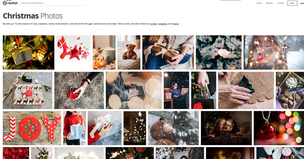 Die Stockfotos von ReShot zeichnen sich durch die Einmaligkeit aus. Es ist möglich, Bilder für verschiedene Projekte nach Belieben kostenlos einzusetzen. Die tollen Weihnachtsfotos, die die Plattform anbietet, verdienen deinen näheren Blick. Es gilt zu beachten, dass Fotos nicht weiter verkauft werden dürfen.