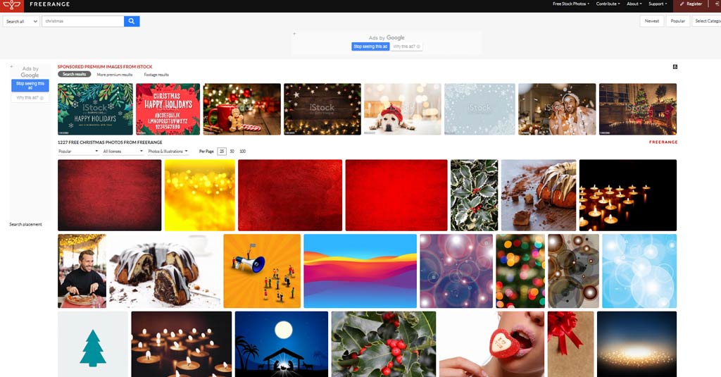 StockFreeImages ist eine hervorragende Sammlung mit Stockfotos, die du komplett frei verwenden darfst. Insgesamt beinhaltet die Fotobank über 2.2 Millionen Bilder, darunter eine große Kategorie mit Weihnachtsmotiven. Um Fotos herunterladen zu dürfen, solltest du deine E-Mail hinterlassen. Was die Verwendung von Bilder für gedruckte Medien geht, so gibt es Einschränkungen.