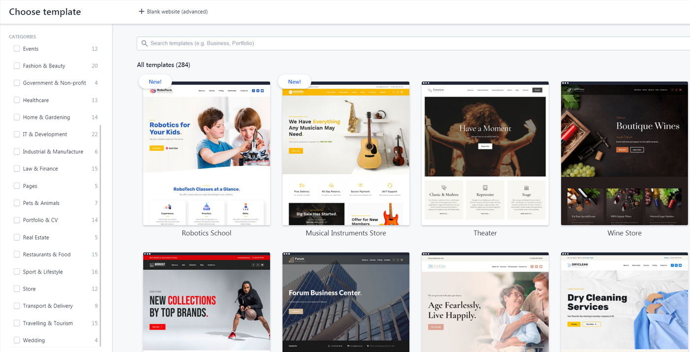 Für MotoCMS3 gibt es eine ziemlich größere Auswahl an Templates, weil am System seit über 10 Jahren gearbeitet wird. Es geht nicht nur um eine riesengroße Design-Palette, die ganz verschiedene Bereiche abdeckt, – von Technologien über kreative Nischen bis hin zu Themen rund um Mensch und Gesellschaft, sondern auch um die Vielfalt der Website-Typen. MotoCMS3 bietet Vorlagen für mehrseitige Websites, Onepager, Premium Templates mit zusätzlichen Blocks sowie E-Commerce-Templates für Onlineshops. Insgesamt stehen dir über 2000 Designs zur Verfügung.