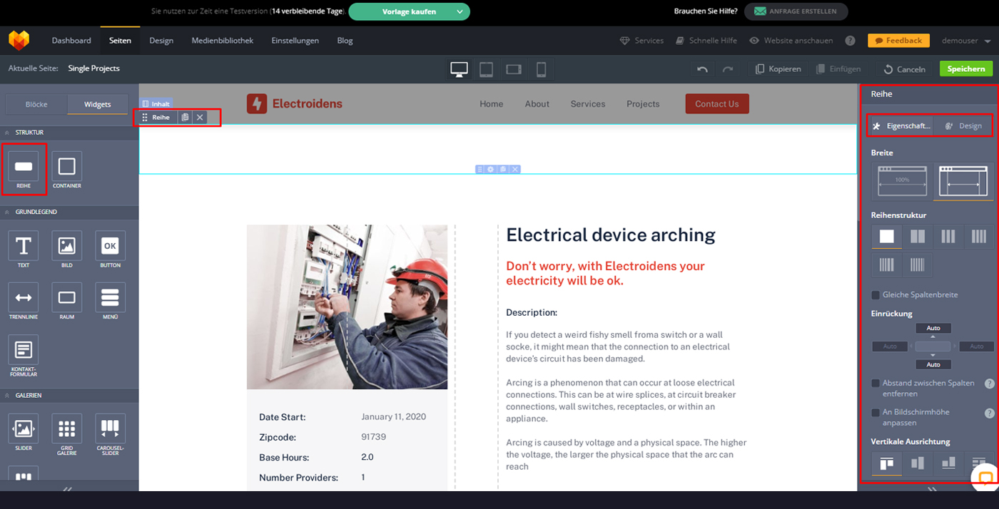 Bei MotoCMS3 ziehst du das Reihe-Widget zur gewünschten Sektion und legst du es ab. Im Tab rechts tätigst du weitere Einstellungen in Bezug auf die Breite, Ausrichtung, Design usw. Auf diese Weise lassen sich alle Widgets, die im Widget-Tab aufgelistet sind, zu Seiten hinzufügen. Mit MotoCMS3 lässt sich jede erdenkliche Art von Layouts erstellen.
