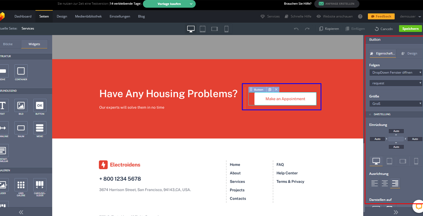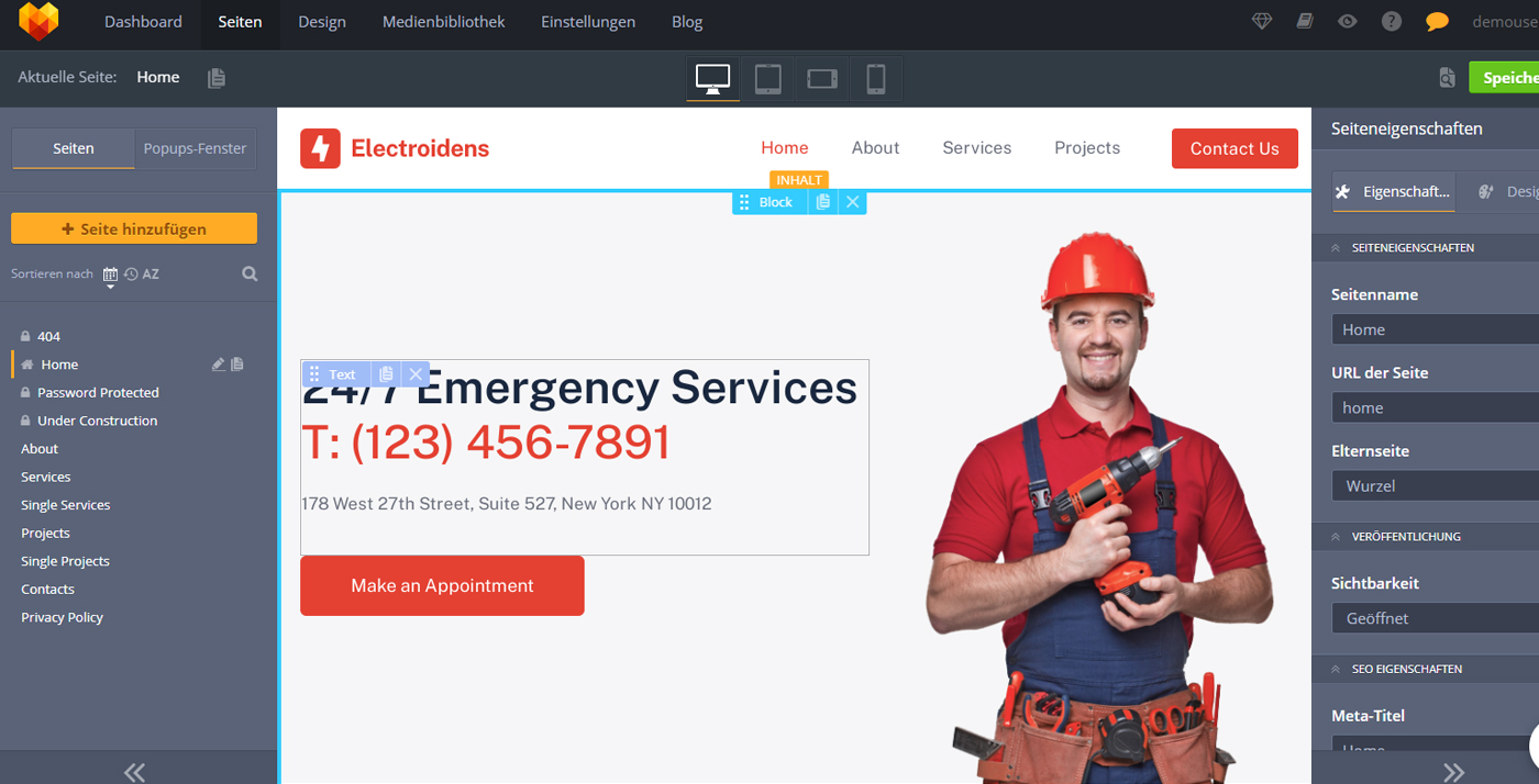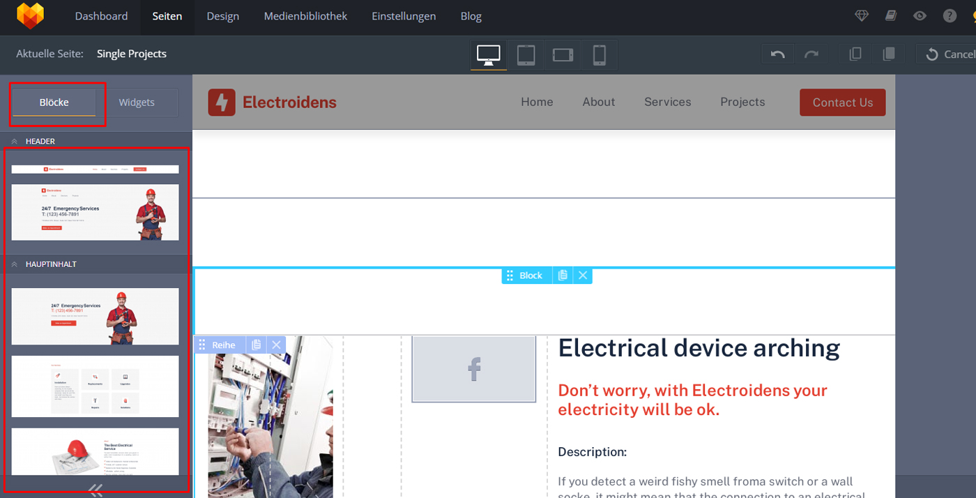 Bei MotoCMS3 Templates aus der Premium-Kategorie (z.B. Electroidens in unserem Beispiel) findest du auch fertige Blocks, die du auf Seiten miteinander kombinieren und nach deinem Wunsch ändern kannst. Im Gegensatz zu Moto4, wo sich in der Bibliothek diverse Blocks in verschiedenen Varianten ausgeführt befinden, geht es bei MotoCMS3 um Teile des fertigen Templates, die du für neue und bestehende Seiten verwenden kannst.