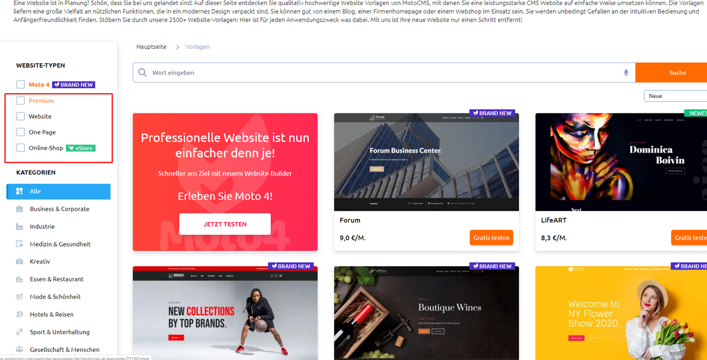 Moto4 als relativ neuer Baukasten bietet eine vergleichsweise kleinere Sammlung, die derzeit aus 20 Kategorien besteht und ca. 300 Designs zählt. Darunter sind einseitige und mehrseitige Vorlagen für jeden Anwendungszweck sowie Webshop-Templates. Die Aufteilung in Kategorien, die Typen sowie die ganze Sammlung werden sichtbar, wenn du dich für das Testen anmeldest.