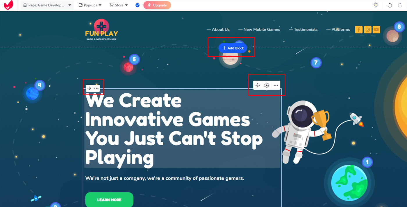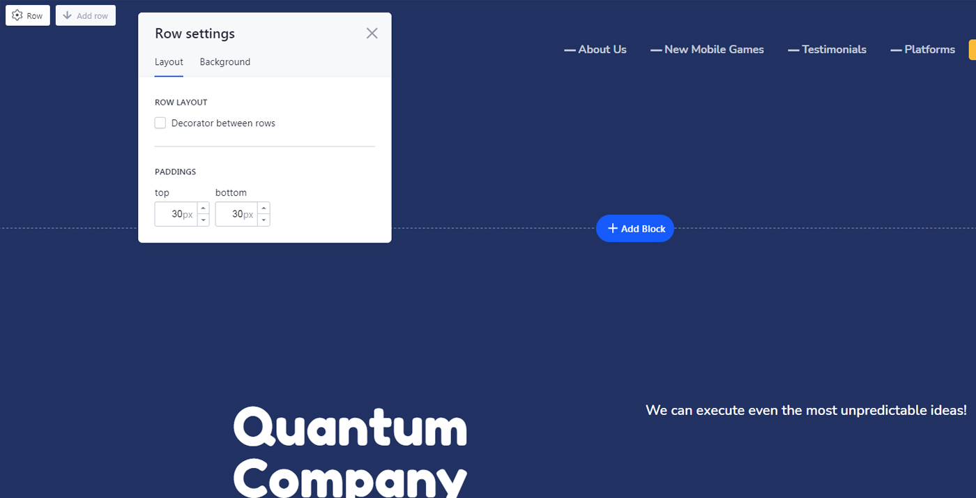 Die beiden Baukästen lassen umfassende Änderungen am Layout und verfügen über Basis-Elemente wie Spalten, Reihen, Abstände. Du kannst bestehende Reihen und Spalten bearbeiten, neue hinzufügen, deren Höhe und Breite festlegen, oder die neu gebaute Struktur mit Elementen füllen. Sowohl bei Moto4 als auch bei MotoCMS3 kannst du neue Seiten von Grund auf Null bauen.