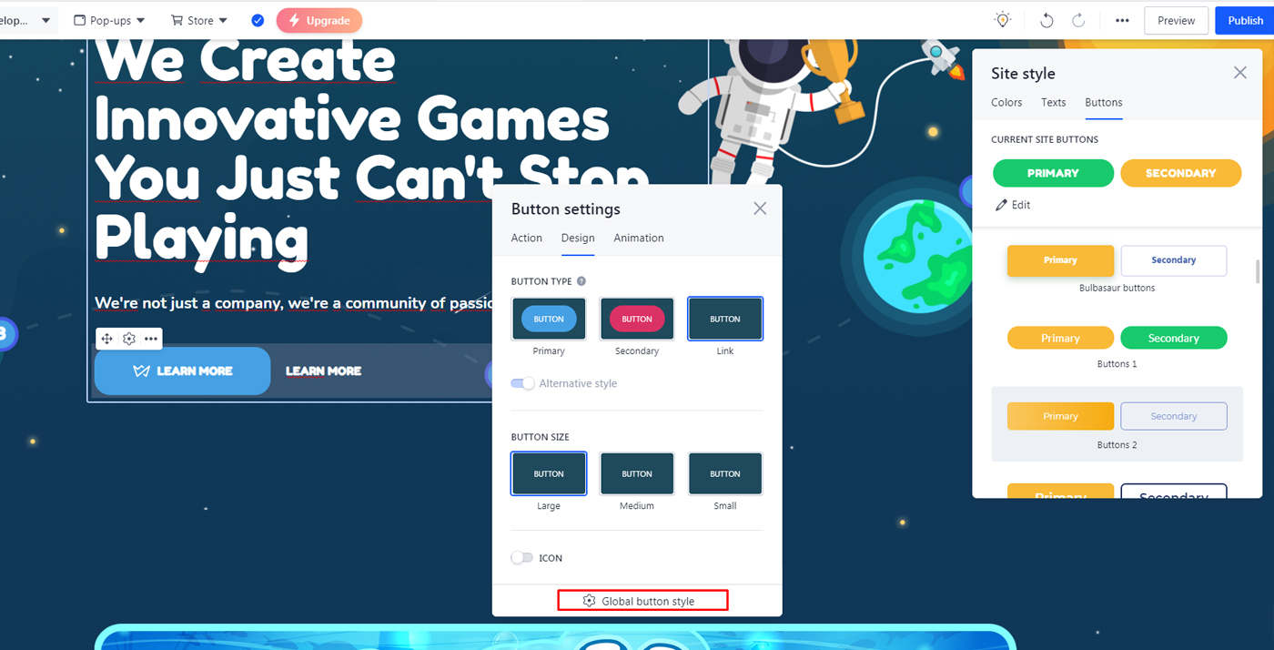 Sowohl bei Moto4 als auch bei MotoCMS3 ist es möglich, das Template auf deine individuellen Bedürfnisse abzustimmen. Du kannst Farben, Schriften, Größen der Elemente einrichten, z.B. den Buttons Aktionen oder Animationseffekte zuweisen, deren Größe und Position auf der Seite festlegen. Bei Moto4 bekommst du per Klick auf das Element einige vorgefertigte Design-Variationen zu sehen. Wenn du mehr Button-Vorlagen brauchst, klickst du auf “Global button style”. Die vorgefertigten Designs lassen sich bis ins Detail wie beliebt anpassen.