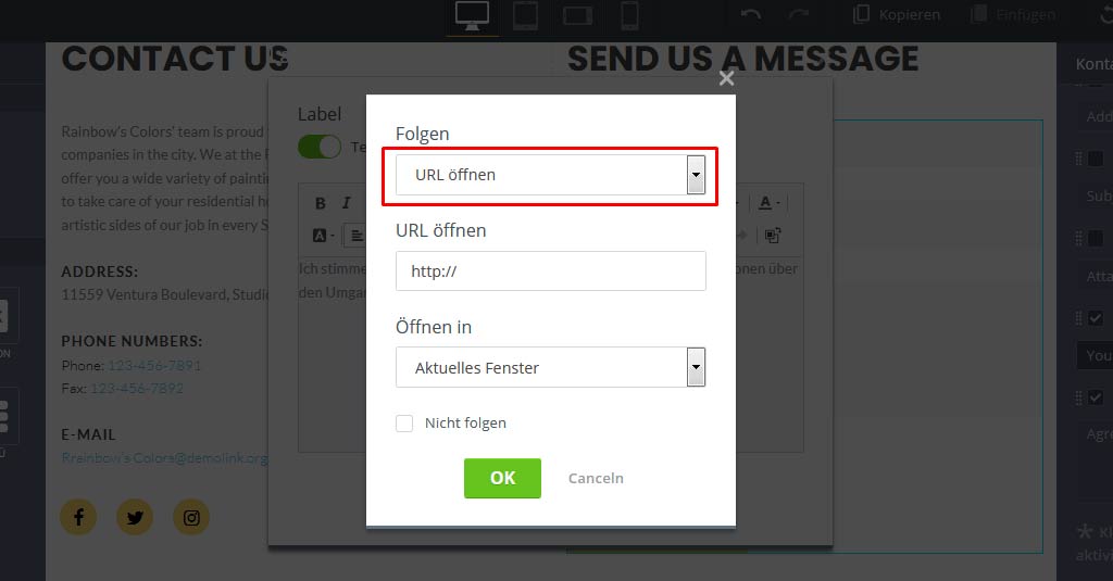 In einem neuen Fenster solltest du “URL öffnen” oder “Zur Seite springen” im Feld Folgen wählen und den Pfad zu deiner Datenschutzrichtlinie angeben.