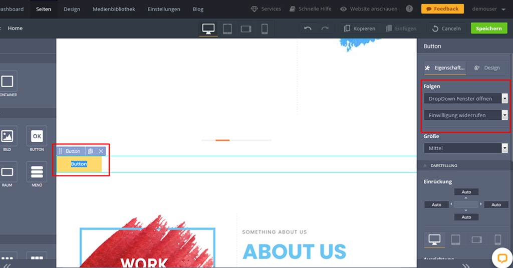 6. Danach solltest du Einstellungen für den Button tätigen, damit sich das erstellte Popup bzw. Seite per Klick öffnet. Klicke auf den Button-Text, um den zu ändern. Dann lege die Aktion fest, die durch Klick ausgeführt werden soll.