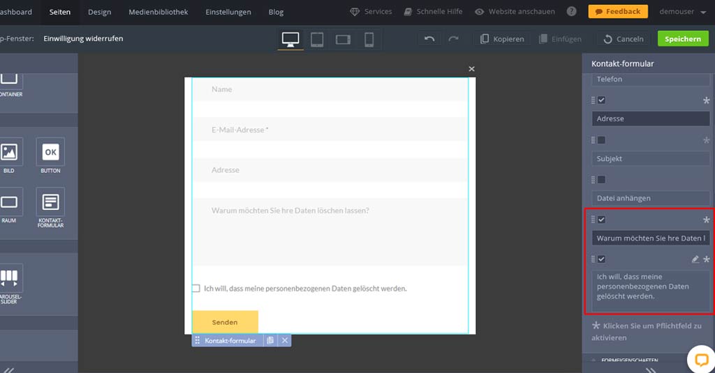 Wie es die EU Datenschutzverordnung vorschreibt, solltest du deinen Besuchern die Möglichkeit geben, ihre Einwilligung zur Datenverarbeitung zu widerrufen und dich darum zu bitten, ihre personenbezogenen Daten zu löschen. Du kannst hierfür einen Button oder einen Link erstellen, der deine Besucher zur separaten Seite oder zum Popup mit einem Kontaktformular führt. Durch das Ausfüllen des Formulars kann der Besucher die zuvor erteilte Zustimmung zurückziehen. Befolge diese Schritte, um diese Option umzusetzen: