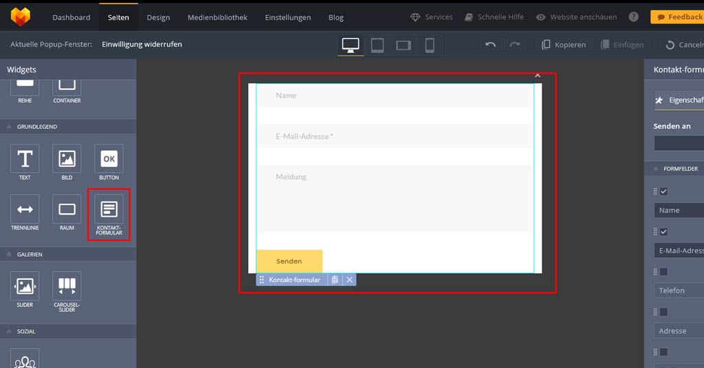Ich klicke auf Bearbeiten, klicke das Widget Kontaktformular an und ziehe es in den Popup-Bereich.