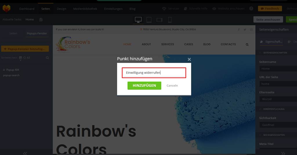 2.Als Nächstes solltest du das Popup so benennen, dass es für Besucher verständlich ist, welchen Zweck es hat, z.B. “Einwilligung widerrufen” und auf den Button „Hinzufügen“ klicken.