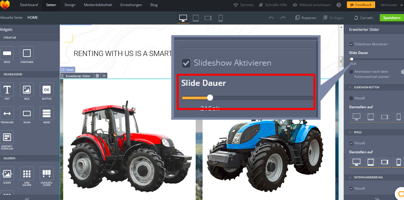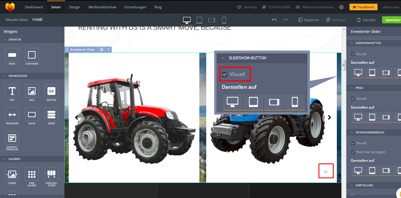 Mit diesem Widget kannst du Video-Slider erstellen oder Folien mit verschiedenen Elementen füllen – Reihe, Text, Bild, Button, Trennlinie und Raum.