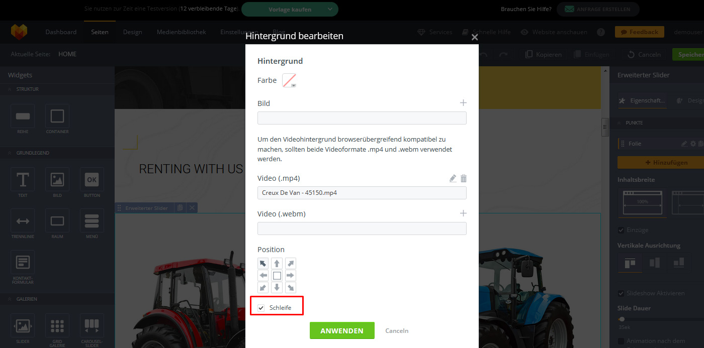 Falls du das Video als Hintergrund einrichten möchtest, erscheint das Feature “In Dauerschleife abspielen” statt “Fixiert”. Das Video wird abspielen, bis die Seite geschlossen wird oder ein Besucher zu anderen Seiten navigiert.