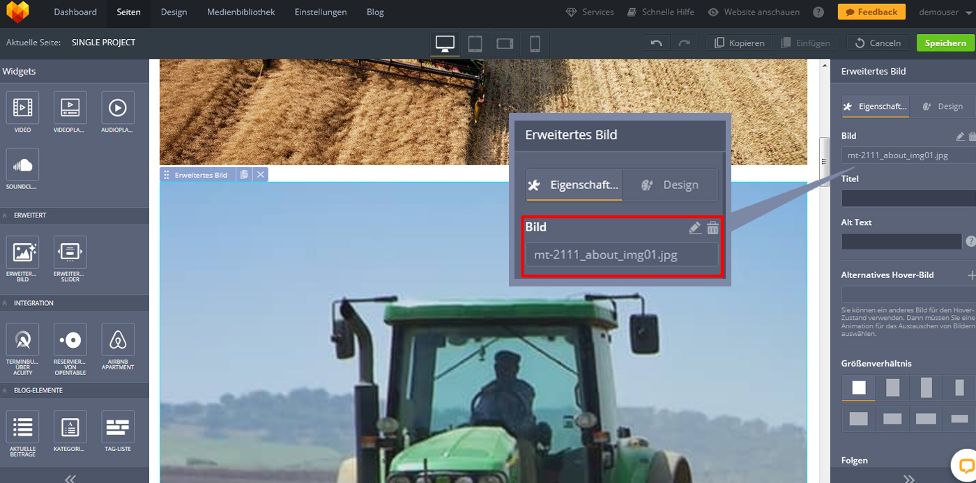 Scrolle ein wenig hinunter, um zu Website-Widgets, die zur Gruppe “Erweitert” gehören, zu gelangen. Im Panel rechts befinden sich die Einstellungen für jeweilige Seite. Um sich verfügbare Optionen z.B. für “Erweitertes Bild” anzuschauen, solltest du entweder das Widget in der Liste anklicken, zur Seite ziehen und fallen lassen oder das bereits eingefügte Widget auf der Seite anklicken. Daraufhin erscheinen Einstellungen, die aus zwei Tabs bestehen – Eigenschaften und Design.