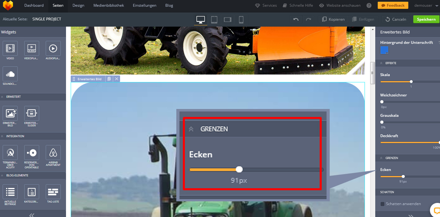 Unter „Grenzen“ kannst du die Ecken des Widgets “Erweitertes Bild” abrunden.