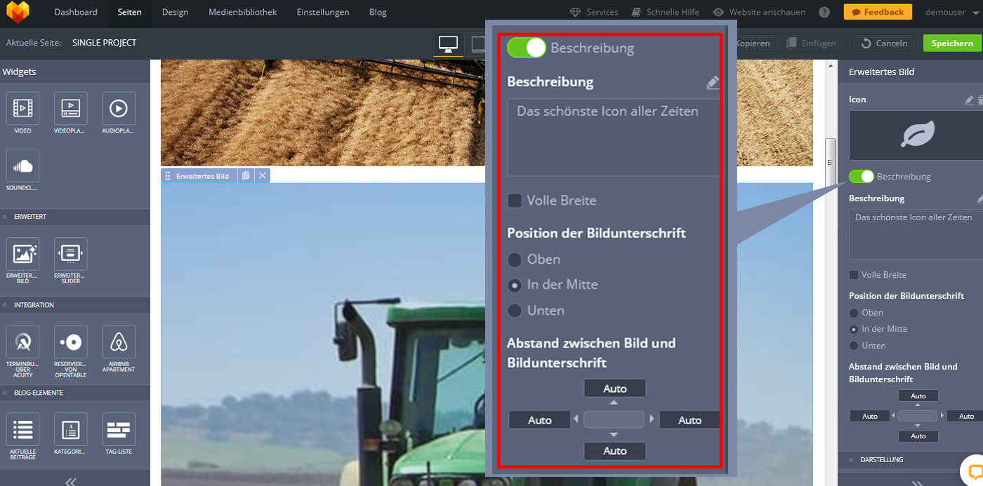 „Volle Breite“ – Solltest du hier ein Häkchen setzen, wird sich die Beschreibung über die volle Breite des Bildes strecken.