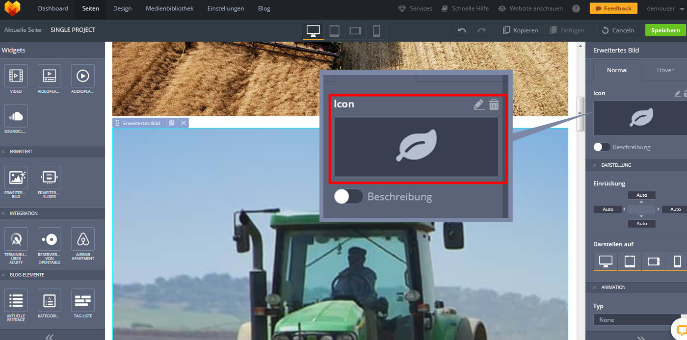 Mit „Icon“ weist du dem Bild (mit oder ohne Hover-Effekt) ein Icon aus der Liste zu.