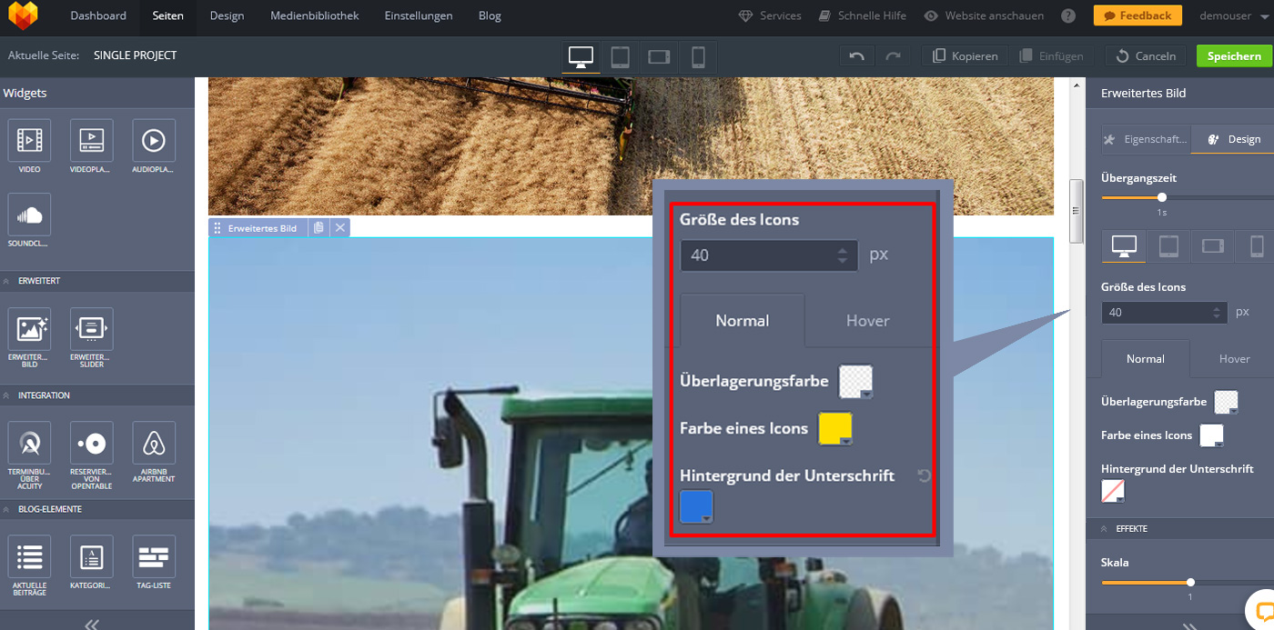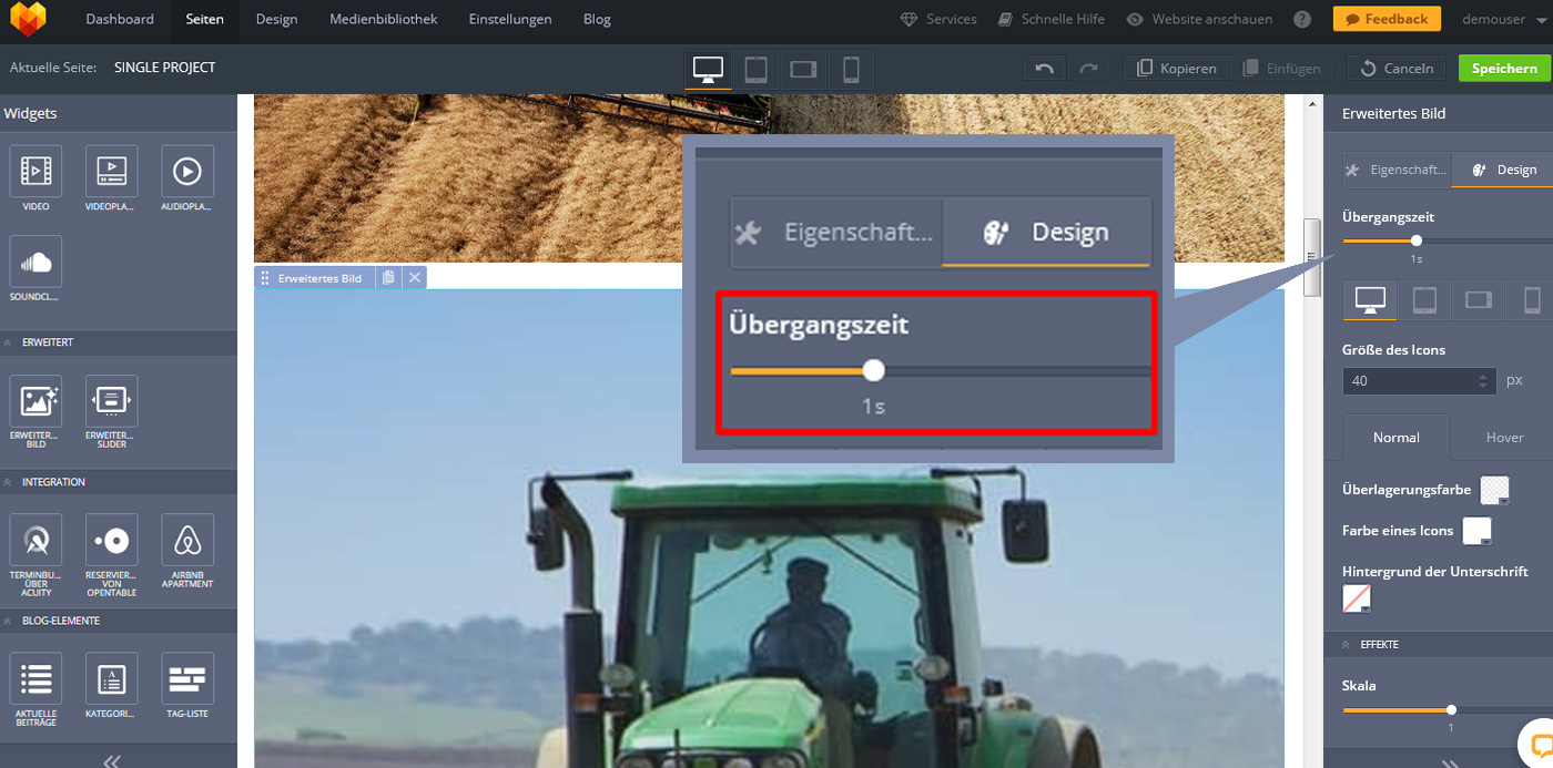 „Übergangszeit“ – Hier lässt sich die Übergangszeit zwischen der Normal- und Hover-Ansicht einstellen. Wenn es um ein Bild ohne Hover-Effekt geht, so beeinflusst diese Option das Überblenden zwischen dem Icon und Bild.