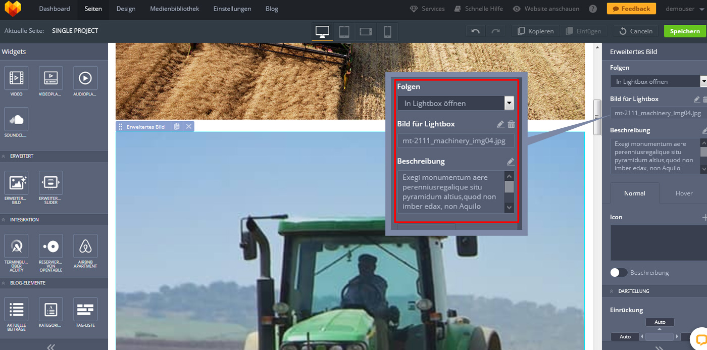 „Folgen“ aktiviert bzw. deaktiviert die Umleitung beim Klick auf das Bild. Wenn du beispielsweise “In der Lightbox öffnen” auswählst, kannst du die Beschreibung zum Bild hinzufügen und deren Text formatieren.