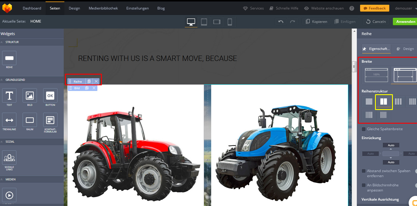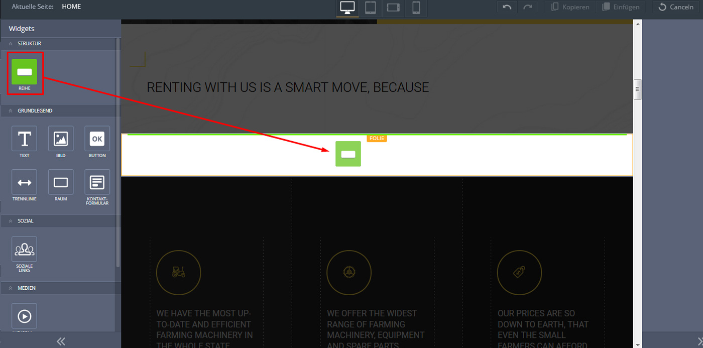 Jedes Widget, das du für eine Folie verwedest, lässt sich individuell einrichten. Beim Reihe-Widget gibt es z.B. Einstellungen, um die Spaltenanzahl festzulegen, Abstände u.a.m. zu editieren.