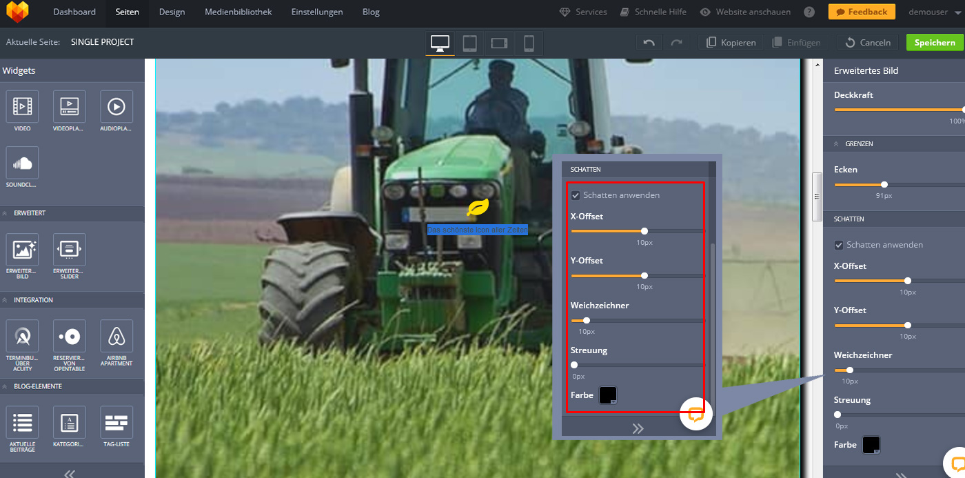 Unter „Schatten“ erstellst du Schatteneffekte mit den Einstellungen: X Offset, Y Offset, Weichzeichnen, Streuung (Größe) und Farbe.