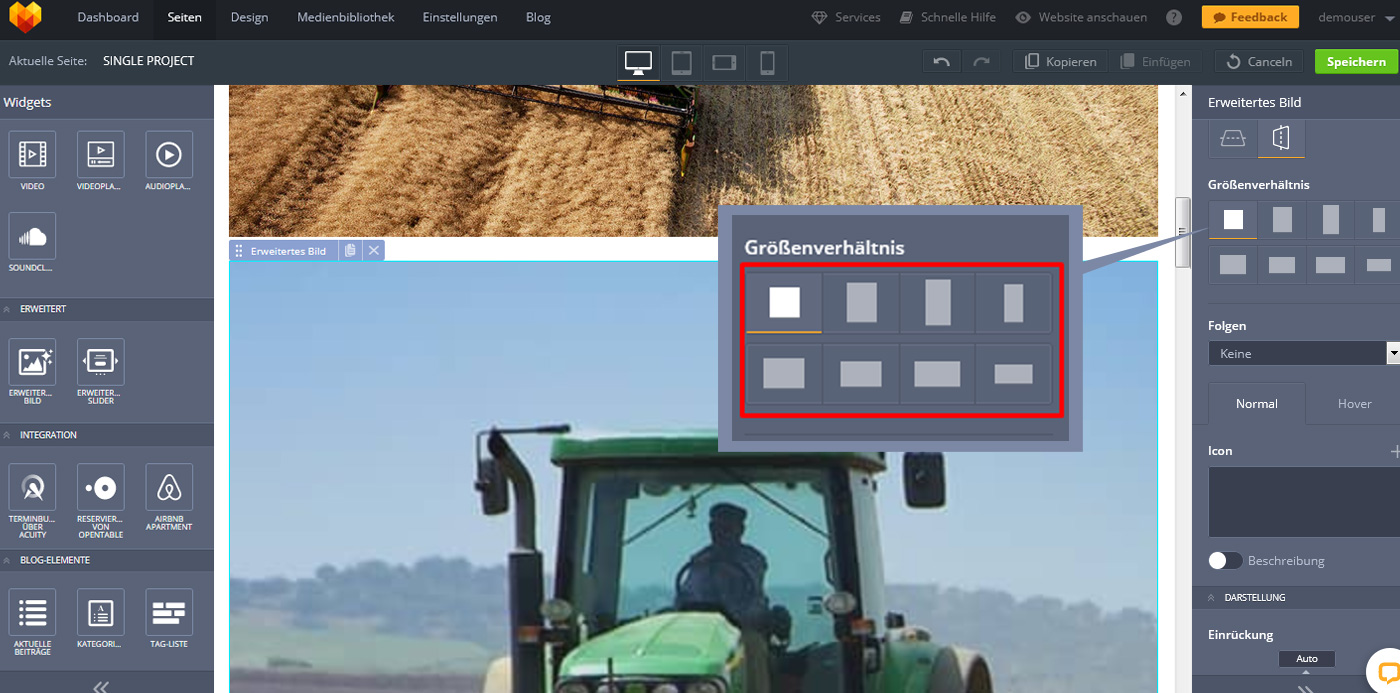 Über „Größenverhältnis“ lässt sich das Seitenverhältnis des Bildes einstellen. Dir stehen Quadrat, vertikales Rechteck und horizontales Rechteck zur Auswahl.