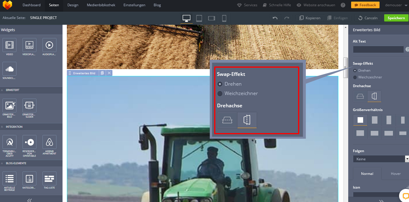 „Swap Effekt“ steht für den Austausch. Hier kannst du bestimmen, auf welche Weise deine Bilder per Maus-Hover wechseln sollen. Es gibt zwei Möglichkeiten, Bilder auszutauschen: durch das Drehen und Weichzeichnen.
