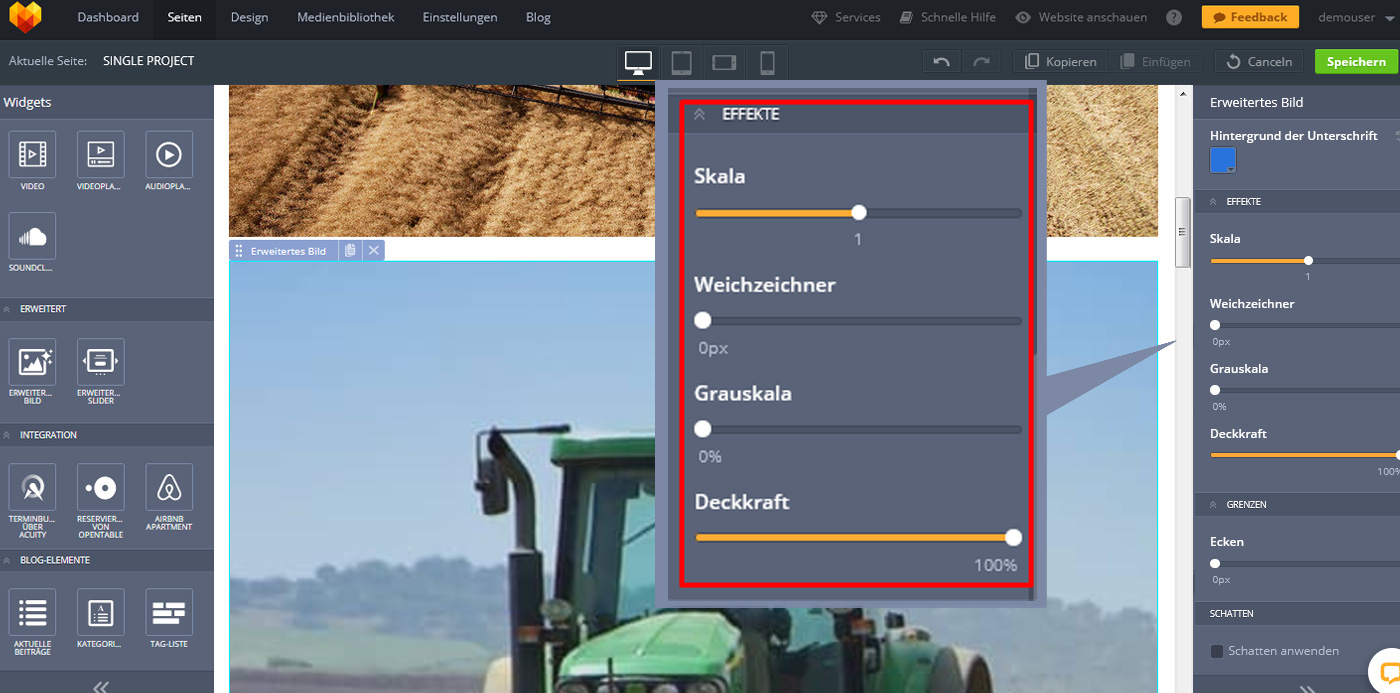 Unter „Effekte“ kannst du vielfältige Effekte auf das Hauptbild anwenden. Skala wirkt sich auf den Grad der Bildvergrößerung beim Hover aus. Mit Weichzeichnen lässt sich der Unschärfe-Effekt realisieren. Grauskala wandelt dein Bild beim Hovern in ein Graustufenbild um. Mit Deckkraft gibst du die Transparenz des Bildes vor.