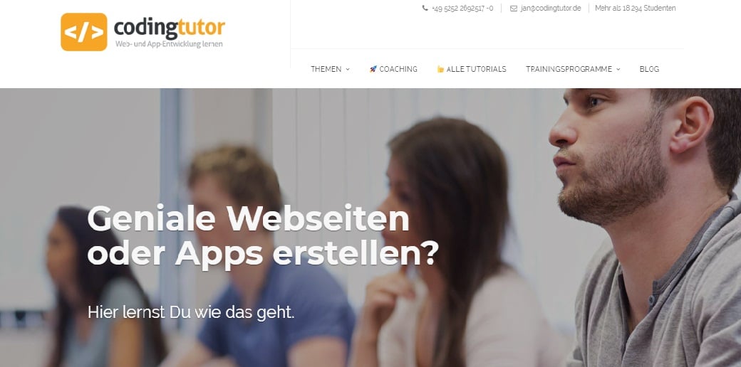 Codingtutor.de ist die Akademie für App- und Webentwicklung mit im deutschsprachigen Raum. Obwohl sie seit 2015 funktioniert, hat sie schon mehr als 18.294 Studenten. Hier findest Du Onlinekurse, umfangreiche Trainingsprogramme und eBooks. Die Schwerpunkte sind: