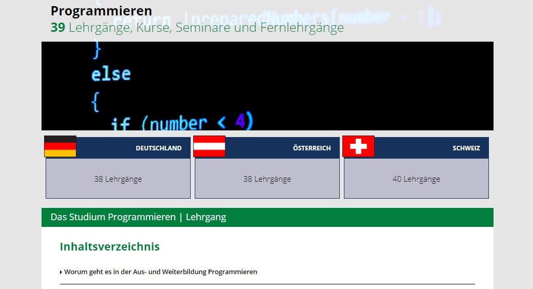 Die informativste und bequemste Seite für Bildungsprogrammen. Hilft, schnell ein Lehrgang in Deutschland, in der Schweiz oder in Österreich zu finden und liefert alle notwendigen Daten – Perspektiven und Zielgruppe, Lernstoff, Vorkenntnisse und Abschluss, Kontakt zu Anbieter und mehr.