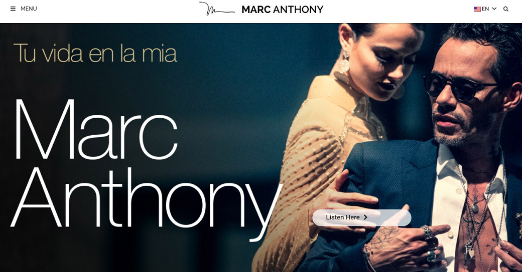 Hier ist ein weiteres Künstler Portfolio – Beispiel eines anderen Stils. Würde dieselbe Designidee von The Prodigy zur Website eines „menschlicheren“ Künstlers wie Marc Anthony passen? Eindeutig Nein! Seine offizielle Homepage wirkt lebendiger und entspannter, was für seine lateinamerikanische Musik angemessen ist.