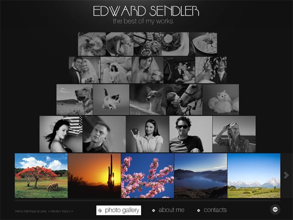 Here is an interesting and stylish approach for presenting images. Have you noticed how beautifully the grayscaled image turns into a color image while being viewed? By the way, the dark background makes other colors to stand out and is a perfect choice for galleries of art and photography.