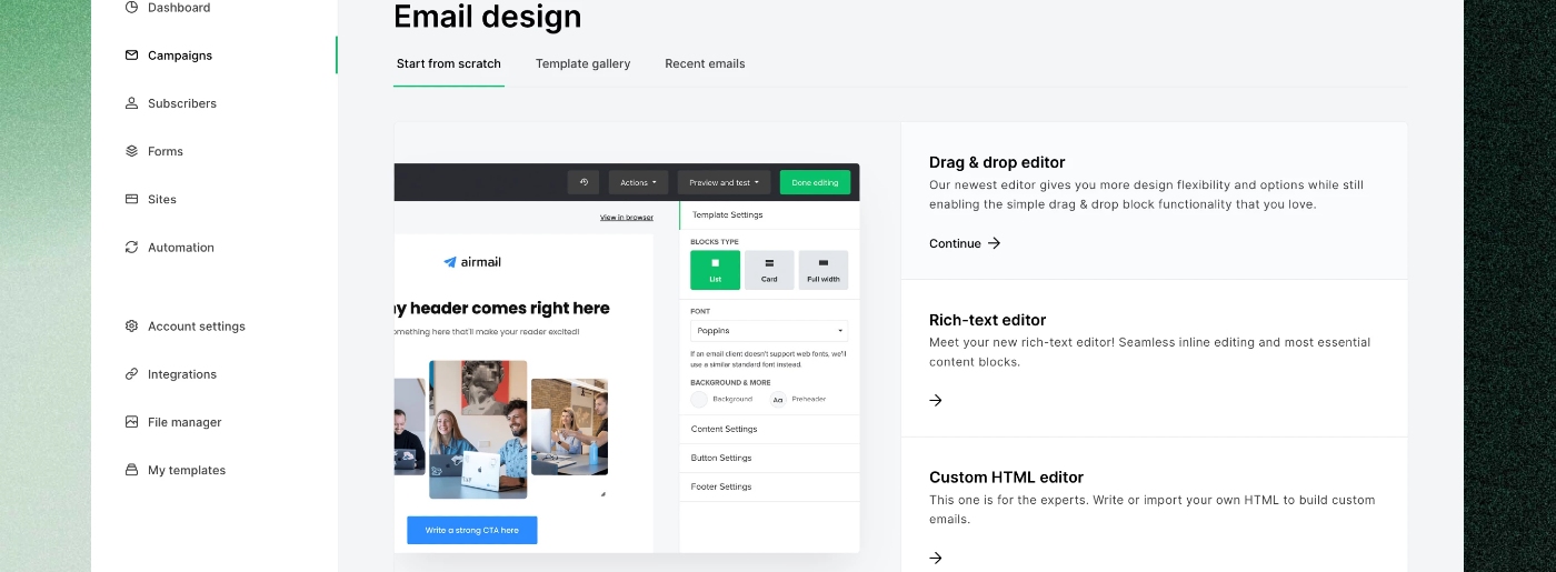 SendinBlue is a top-notch free email marketing tool that works great with WordPress and Elementor. There is a free subscription with unlimited contacts, but you can only send up to 300 emails every day. This daily limitation is still a fantastic choice for small organizations who don’t send out a lot of emails, even though it could appear limiting. Even with its free plan, SendinBlue has a reputation for having a lot of features. Using their drag-and-drop editor and selection of templates, you can generate stunningly designed emails.