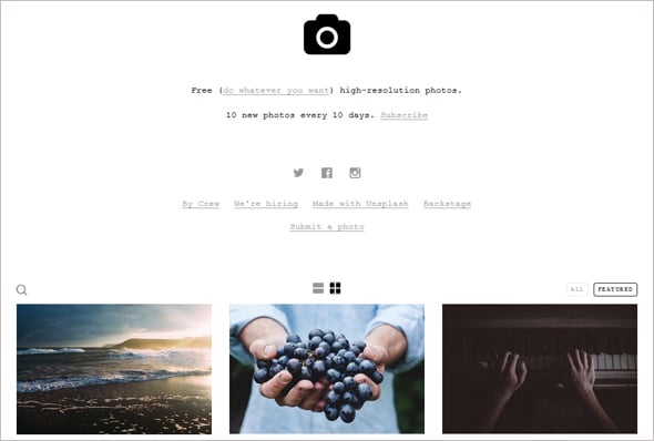 Unsplash.com is another slightly old-school site, channelling the vibe of Parr’s, with a 1980s style typewriter font and slightly quirky photo icon offering print-quality, royalty free images for online use. The site allows you to scroll through the entire catalogue of images, click on one and it’s automatically downloaded.The scrolling gallery site is a great option for photographers and that’s easy to achieve using a portfolio-based template.