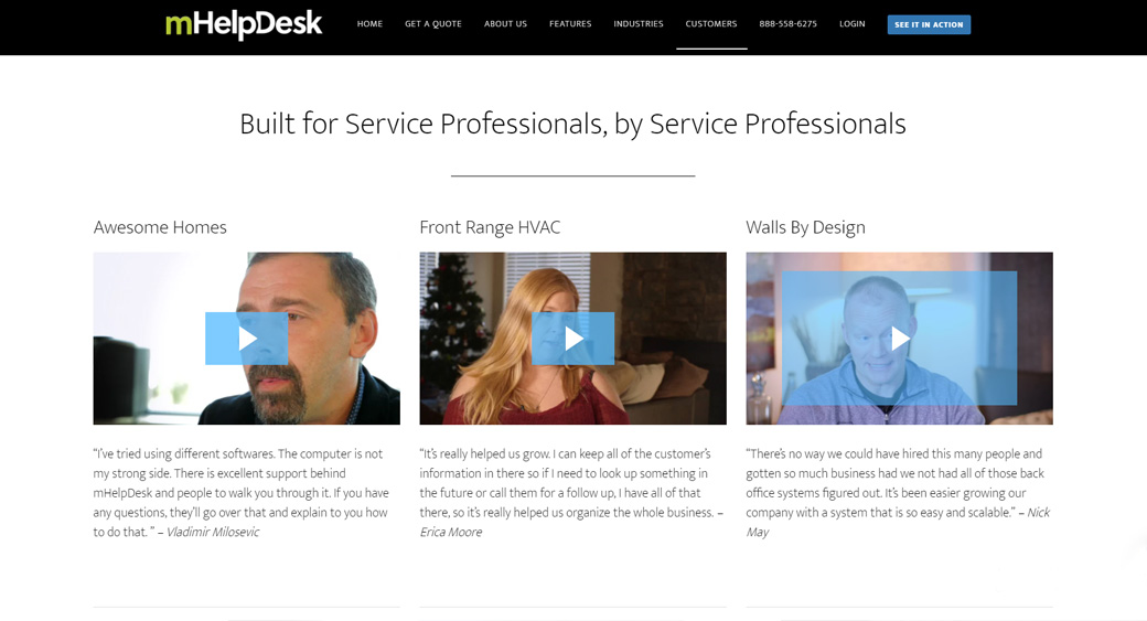 Video testimonials are their hallmark! The mHelpDesk customer page is also focused on detailed text testimonials, ratings from different platforms (Capterra, Trustpilot, Software Advice), and case studies.