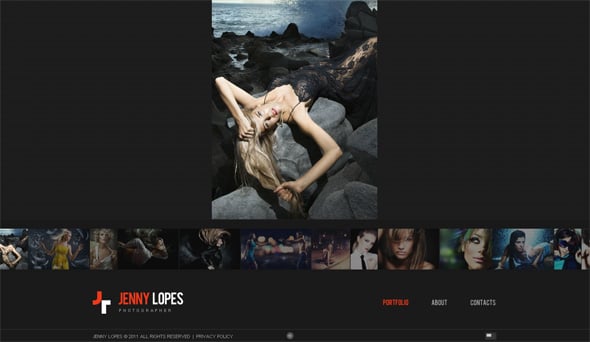 This photo portfolio template looks like an ordinary one until you don’t touch its menu with the your mouse pointer. Click the Portfolio menu item and you’ll see a strip of thumbnail images with short descriptions. You can scroll them by hovering a mouse pointer here and there.