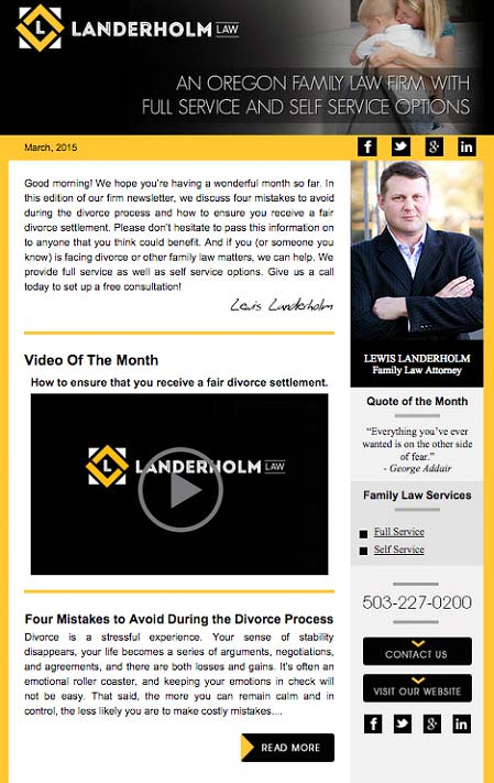 The goal is to keep recipients informed and boost their confidence in the attorney’s ability to handle their specific type of legal issue should they need further representation. For example, a auto accident lawyer can create a newsletter with helpful tips on how to recover damages after being injured in an accident. The newsletter should be sent out at least once a month and include information on handling insurance companies, getting medical treatment, and filing claims against them. Similarly, a divorce mediation firm can send a newsletter to their audience with useful information about using a mediator for their divorce process.