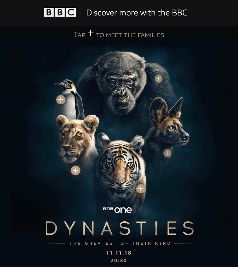 Infographics are typically used in blog posts. Infographics can help readers visualize data and help you build links from relevant publications. If you place one in your email, it can also help boost email conversion rates. Make them interactive, and, chances are, you get more engagement as well. Take a look at this animated email infographic from the BBC. Tapping the cross points reveals additional information about animal dynasties: