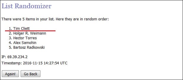 Let’s play our game of chance and draw the universal business website theme from MotoCMS with one true random number service. We created a list with the names of our participants and simply randomized it. You can see the outcome below.