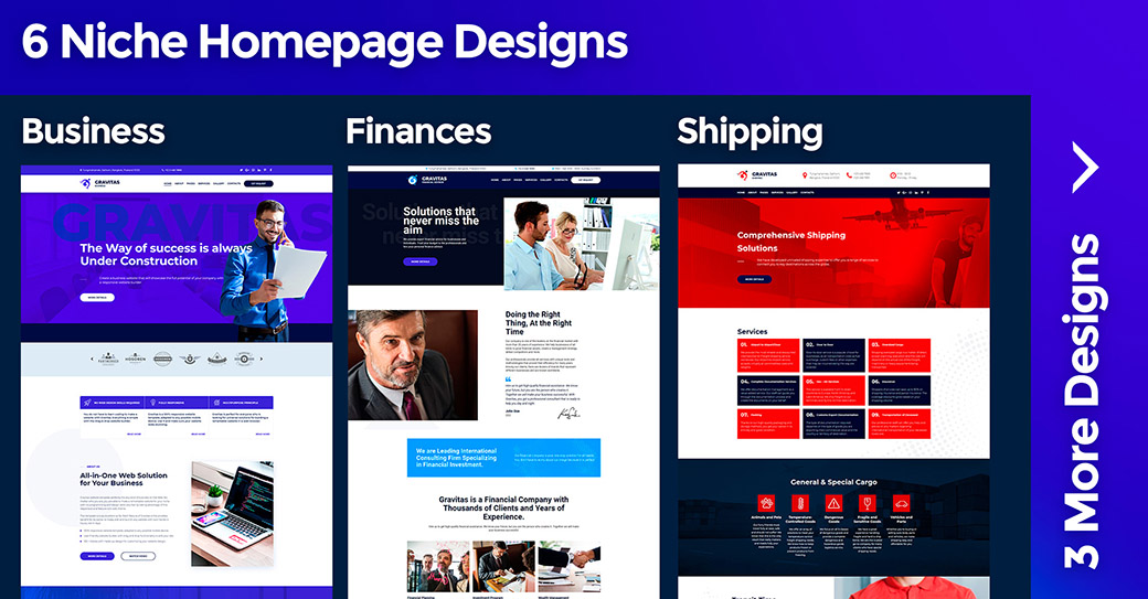 To begin with, Gravitas comes with 6 eye-catching Homepage designs for 6 various niches. They are consulting, finances, shipping, interior design, charity, and travel.