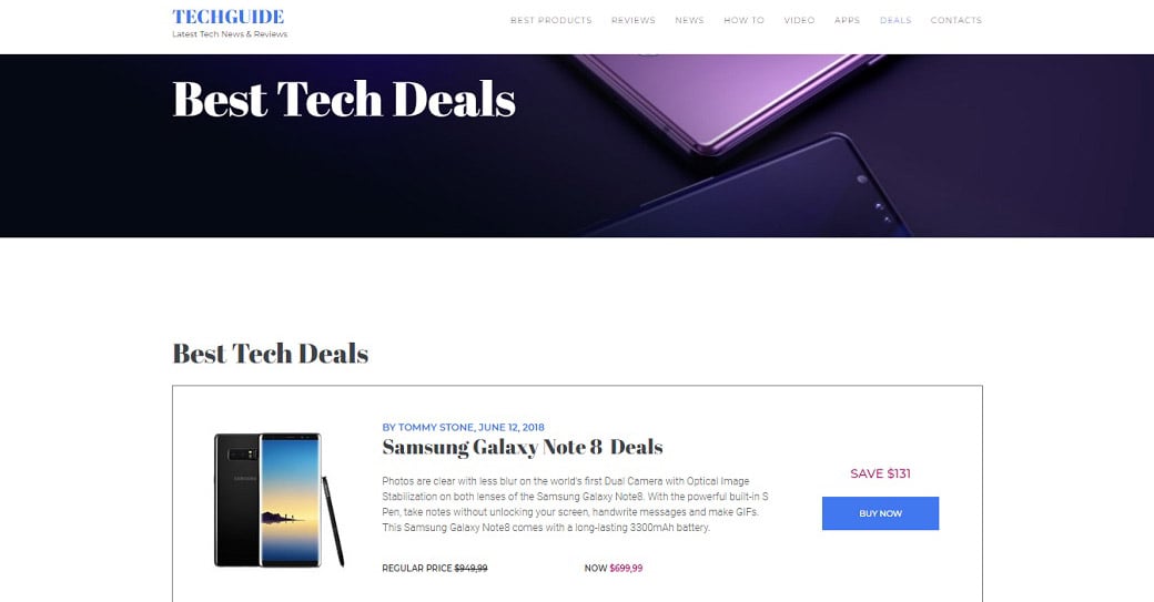 Techguide is a stunning theme from MotoCMS. It’s visually appealing and tech-savvy at the same time. This amazing template has everything to put your knowledge on how to make a review website into practice.