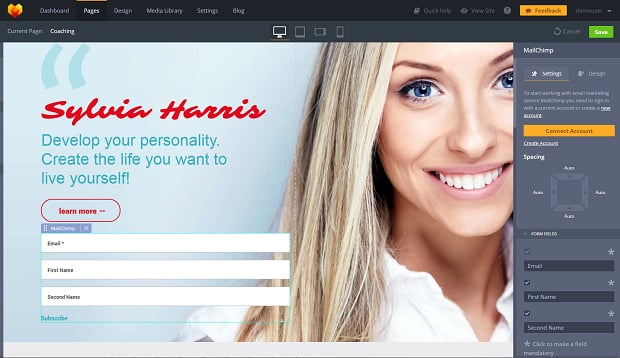 The next important thing is to create newsletters. This is a perfect way to keep your clients informed. With MotoCMS website builder, you can use the MailChimp widget for this purpose. It will cope with this task brilliantly.