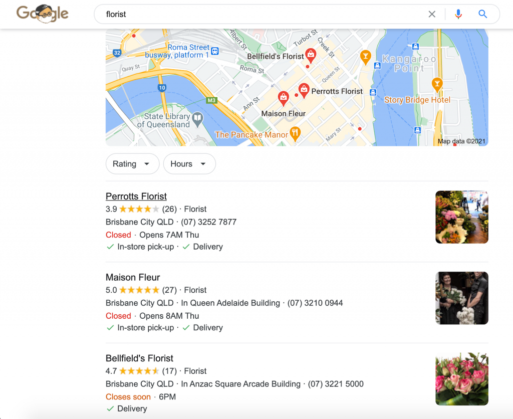 Local SEO refers to optimizing your online presence to rank in the search results for local search terms. With local SEO, you’re trying to generate leads by ranking high in search results for your immediate vicinity (say, your city, state, or country). There are many different types of local SEO searches. The most common searches are for things like “service + near me.” For example, florist, pub, whatever. If you make such a search, Google will use your IP address to provide you with a list of companies that offer the product or service you are looking for in your immediate vicinity. An essential element for much local SEO, especially search terms similar to what I described above, is the Google My Business listings.
