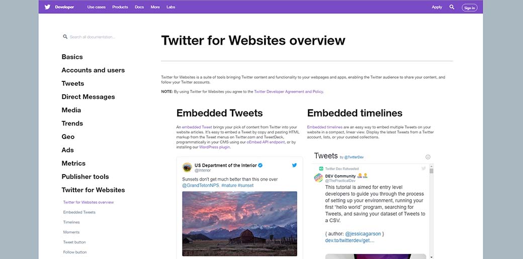 Twitter API is a bit lighter than Facebook. You can use this API to embed Twitter posts, feeds, and share buttons to your site.