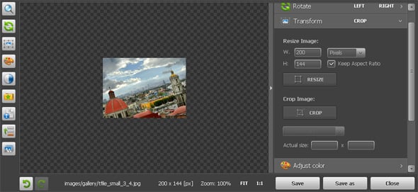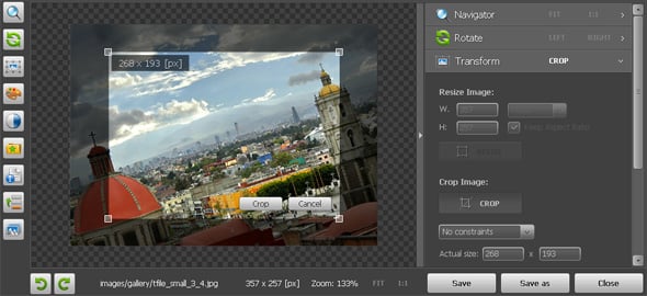 3. We can resize our image by means of the Transform options: resize it in pixels or set percentage ratio, crop the image (with no constraints, by setting the parameters from the dropdown list or by setting the necessary image size in the “Actual Size” boxes. In the process of resizing the image for cropping, the actual size parameters also change, so we can always check the actual width and height of the image before cropping it.